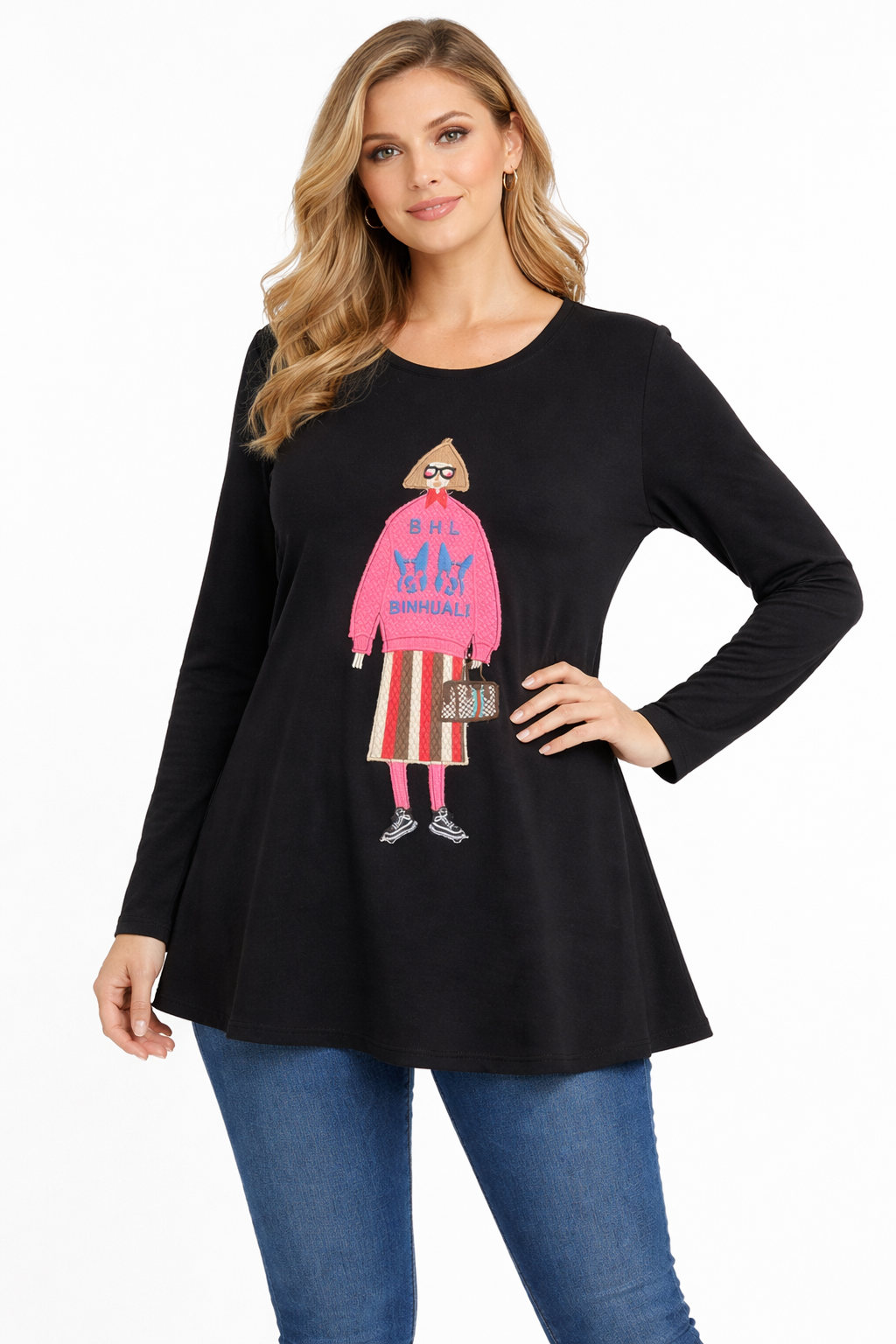 This quirky Bittermoon Fun Tee brings effortless style to everyday dressing. Featuring a charming embroidered fashion illustration appliqué that adds personality and whimsy to your casual wardrobe. Style it with black cropped pants and boots for a contemporary casual look, or pair with denim and trainers for relaxed weekend wear.