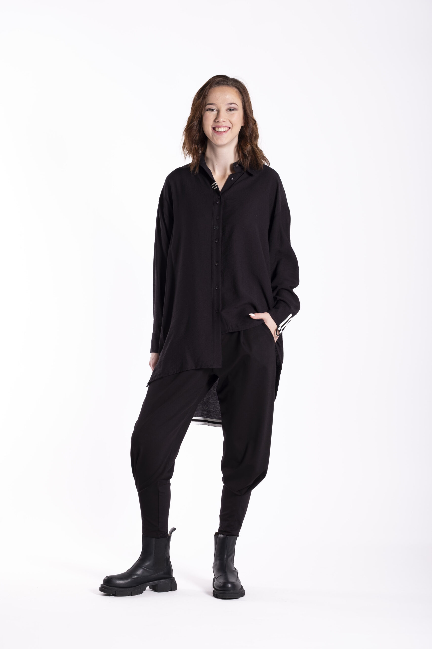 This is a softly structured women’s shirt designed with a relaxed, wearable silhouette and thoughtful tailoring details. Featuring in Black is a classic shirt shape, the Professor Shirt is finished with extra button detailing, adding interest and a subtle design feature while keeping the overall look clean and versatile. This style offers ease through the body with a refined, slightly academic feel.