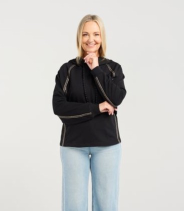 This hooded jumper features trim details along the sides and sleeves, adding subtle shaping and structure. A stylish tie at the hood completes the relaxed, contemporary look, making it a cool, versatile piece.