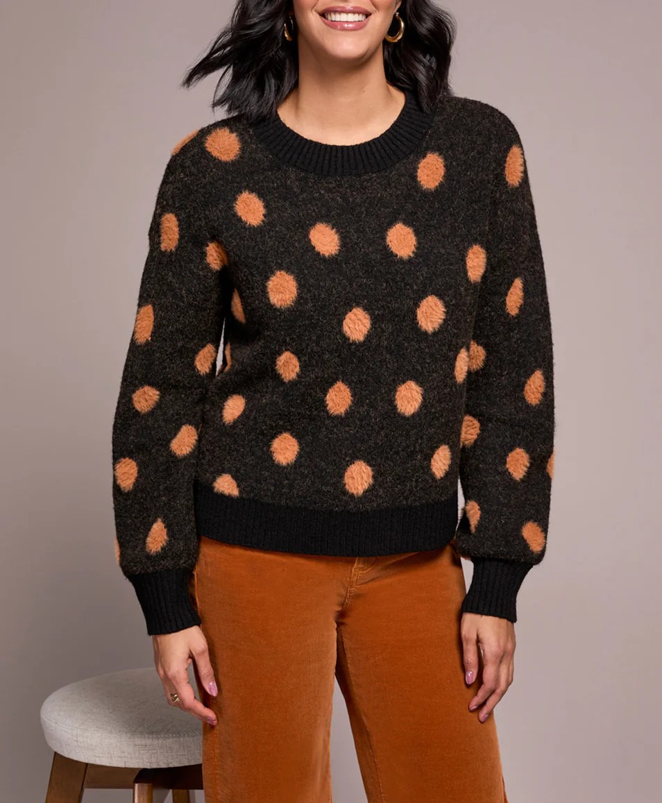 Luxuriously soft in texture, you will love Tribal’s black crewneck sweater with fun butterscotch coloured dots! It has a ribbed neckline, waistband and cuffs, and drop shoulders for a loose, relaxed fit.