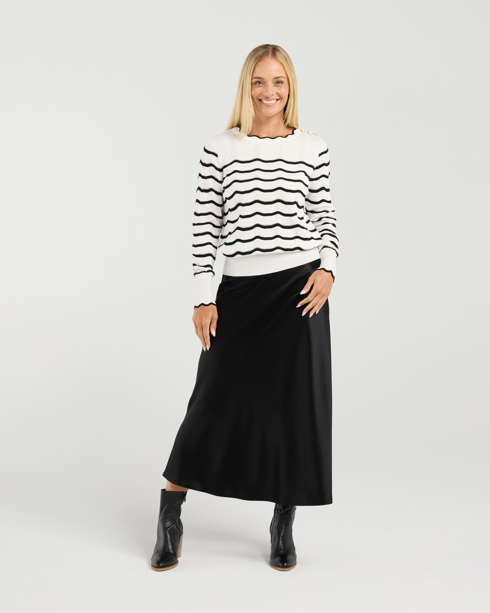 It’s all in the details with the Whitney Lurex Stripe Knit by Blackstone. A durable blend of cotton and lurex provides an elegant yet practical addition to your winter wardrobe. The gold stripe trim scalloped neckline and cuffs bring an elevated feel to any ensemble with the cherry on top being the 3 heartshaped feautre buttons at the shoulderline. Feel put together yet relaxed in the Whitney knit this season. Features: 99% Cotton 1% Lurex fully fashioned knit; Scalloped neckline and cuffs; Gold stripe detailing; gorgeous buttons on shoulder; Pointelle knit detail. Model is 178cm tall and is wearing a size 8